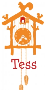 Kaart buiten: Kaart binnen: Model 20 x 20 cm, gevouwen naar 10 x 20 cm De koekoeksklok geeft de geboortetijd aan, de tekening wordt dus na de geboorte aangepast. Kan uitgevoerd worden in kleuren naar wens; langwerpig model.